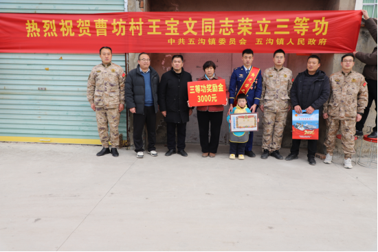 2026年2月20日上午,濉溪县应急管理局副局长张思奎、五沟镇武装部部长李翰林一行前往前往王宝文同志家中,为其送去荣立“个人三等功”的喜报与祝贺。