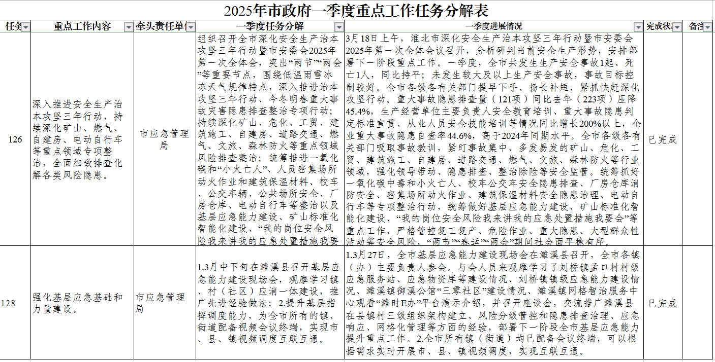 淮北市应急管理局2025年市政府重点工作第一季度完成情况