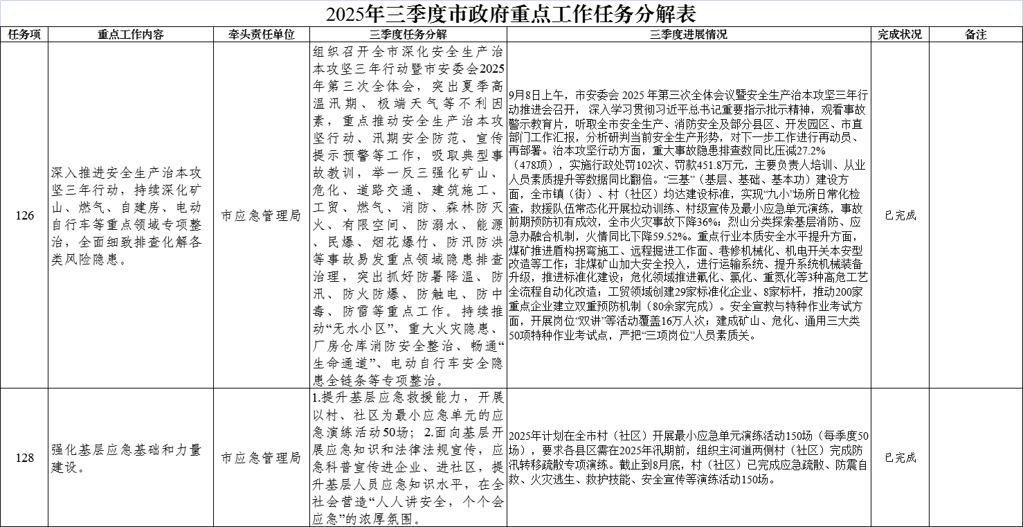 淮北市应急管理局2025年市政府重点工作第三季度完成情况