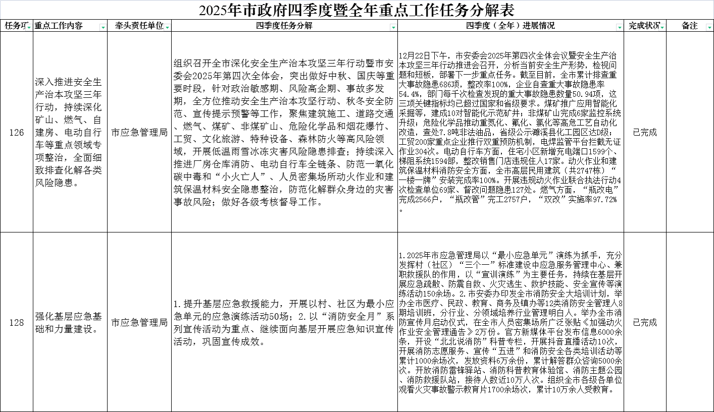 淮北市应急管理局2025年市政府重点工作第四季度完成情况
